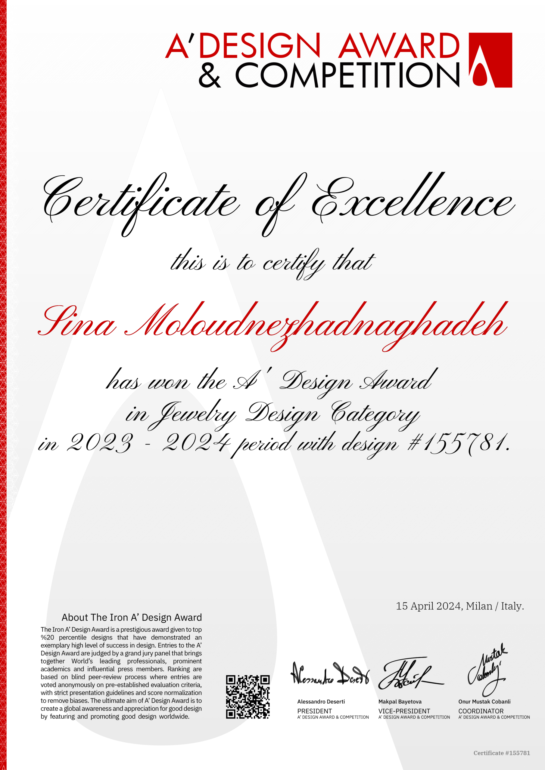 در طی سالهای اخیر، افتخار کسب جوایز معتبر بینالمللی در زمینه طراحی طلا و جواهر را داشتهام؛ از جمله